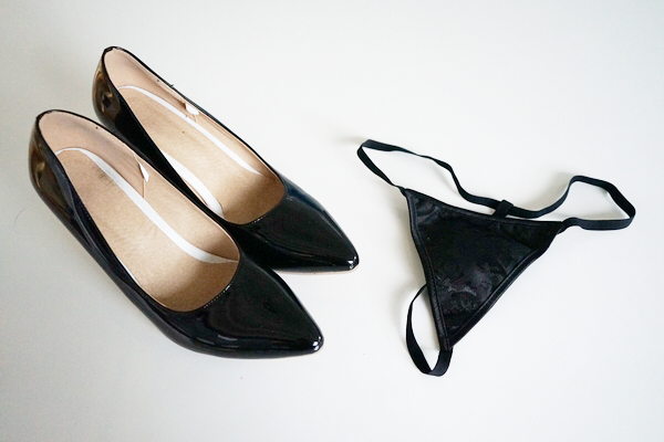 足をスラッとみせるハイヒール、そして体型の視認性をよくするための面積の少ない下着を用意しました。