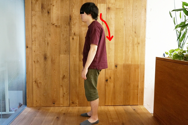 そこで、彼のパソコンの電源を抜いて仕事を中断し、立たせてみると、典型的な猫背でした。