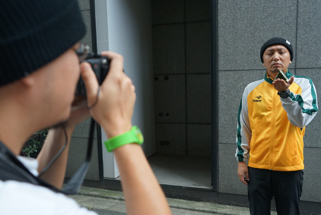 おにぎりを持っていぶかしげな表情の男性を撮っていますが、グルメ記事でしょうか?