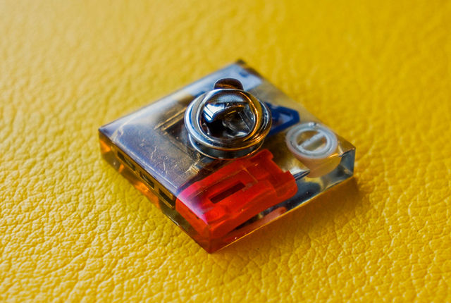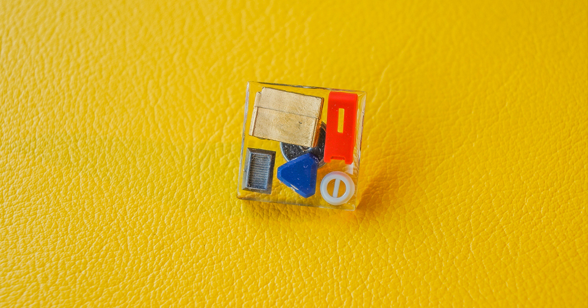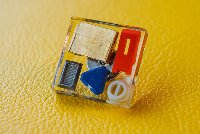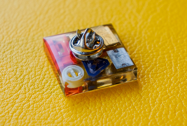 ガンプラのパーツが樹脂で固められているピンバッジを買いました。