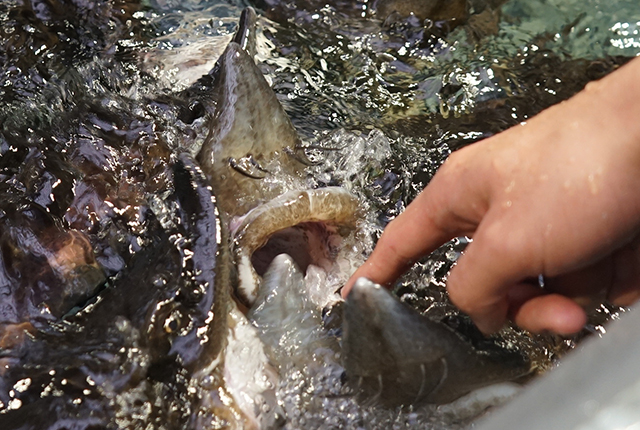 またニジマスの横には、チョウザメが指をパクパクしてくれるコーナーが。すっごく優しくパクパクしてくれました。
