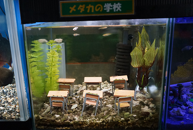 「メダカの学校」という学校の机が置かれた水槽もありましたが、誰も着席しておらず「学級崩壊」という言葉が頭をよぎりました。