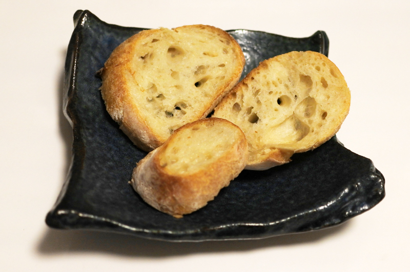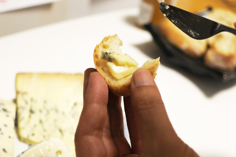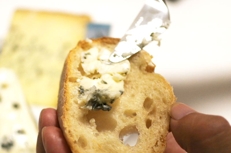 チーズ好きな人はクラッカーみたいな乾きモノに乗せて食べる人が多いんですが、正直、バゲットでしっとり感をプラスしたほうが食べやすいと思います。ブルーチーズは基本的にメチャメチャしょっぱいので、想定外に味が濃かった!という時は、パンの量で塩味を調節をしやすいというのもメリットです。