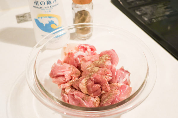 塩コショウをしていきます。このあと味付けをするので塩はホントの少々で大丈夫です。