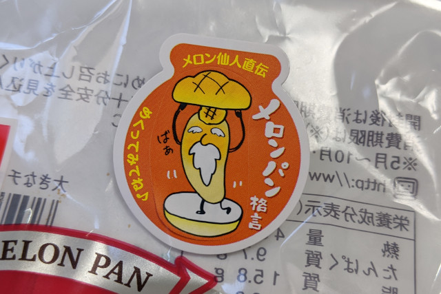 「ゴロゴロ(訳:このパンの包装紙には「メロン仙人直伝『メロンパン格言』」なるシールが貼られていました。どんな格言が書かれているのでしょうか。メロンでもメロンパンでもない仙人の姿には期待が持てます!)」