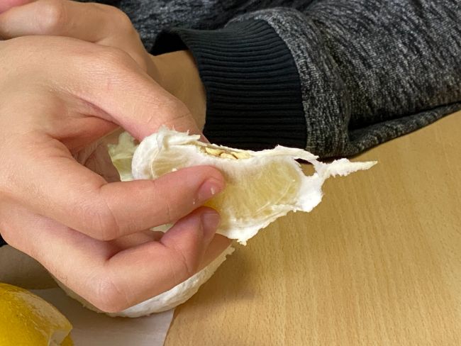 みかんとかは薄皮もそのまま食べても良かったりするけど、グレープフルーツや文旦は中の薄皮が苦すぎて食べられたもんじゃない。なので、そちらも剥かないといけないんです。