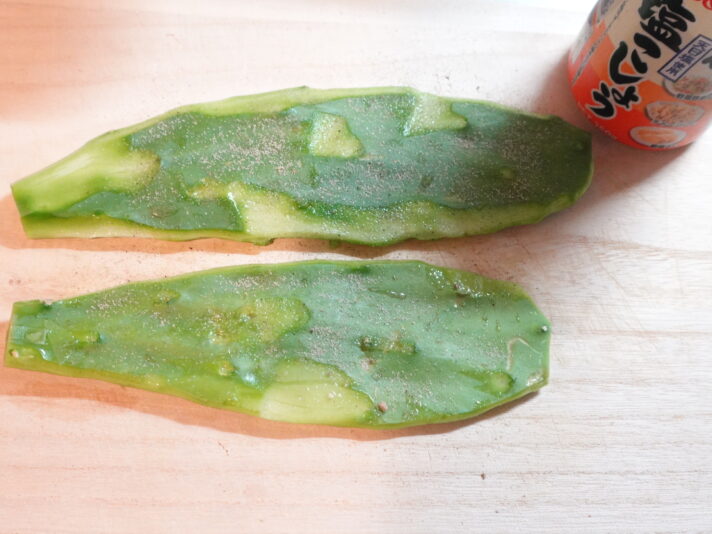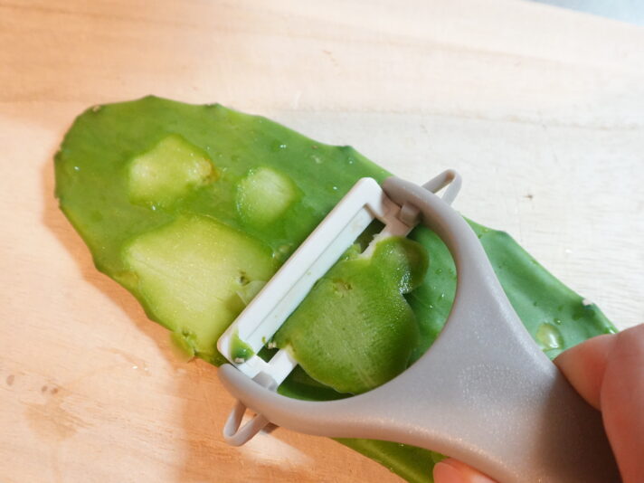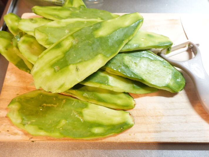 トゲも別に抜いたりしなくても大丈夫で、ピーラーでスルっと取れる。ノパル自体が柔らかいので力もいらず、こりゃ楽だね!