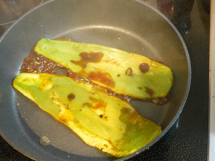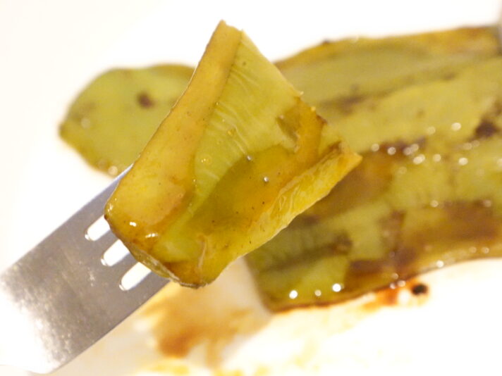 オリーブオイルで焼いてみます。いい感じに焼き色が付いたらしょうゆを少し。青臭さは思ったより気にならないですね。