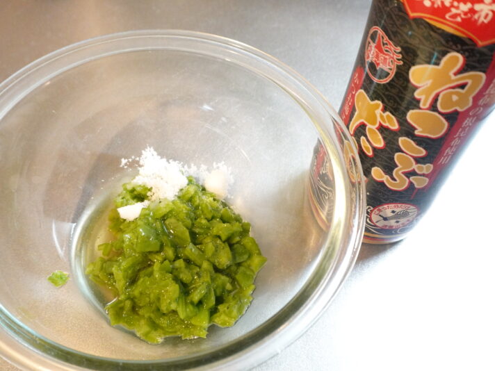 刻んだノパルに砂糖と出汁を加えて軽く混ぜるだけ。出汁はねこぶだしを愛用させていただいております。これは、良いものですよ。全てが楽になります。