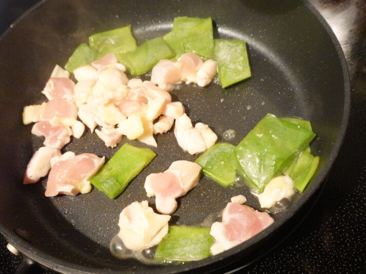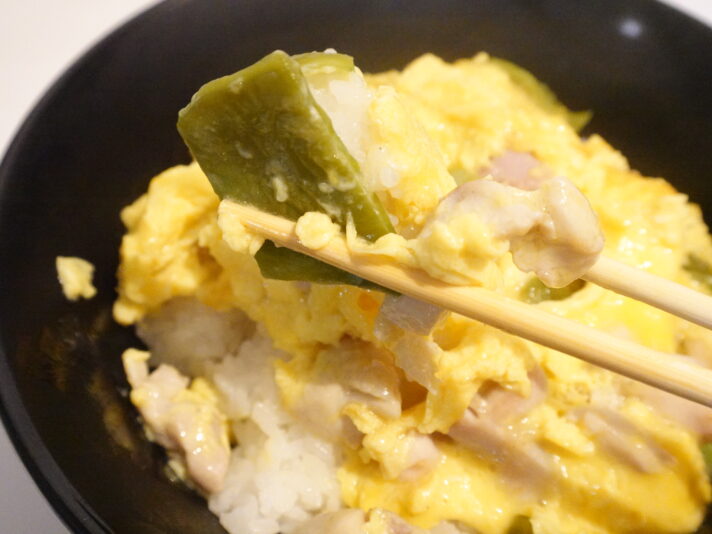 親子丼を作ってみましょう。肉との相性は未知数ですが、夏野菜っぽいので合わないことはないでしょう。塩コショウ、出汁、みりんなどで炒めます。