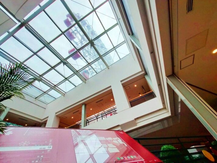 天井がガラス張りで向かいながら観覧車が見えて、めっちゃテンション上がる!