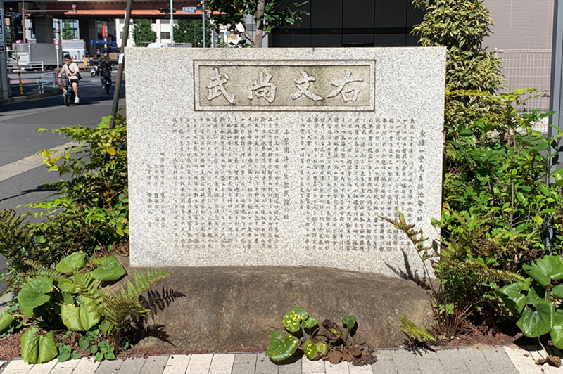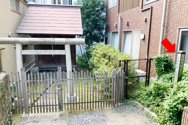 試衛館ができるずっと前からこの場所にあったという稲荷神社の右に、細長い柱のようなものが見えるでしょうか。これが天然理心流の道場・試衛館の跡地を示す碑です
