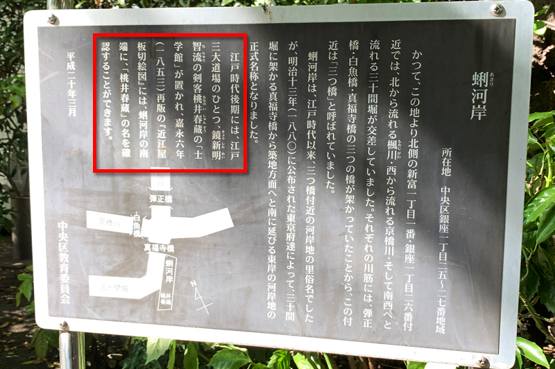 小っっっさい看板が立ってました。メインは「この地には3つの橋が架かってた」っていう情報で、鏡新明智流に関してはちょろっと書かれてるだけでした