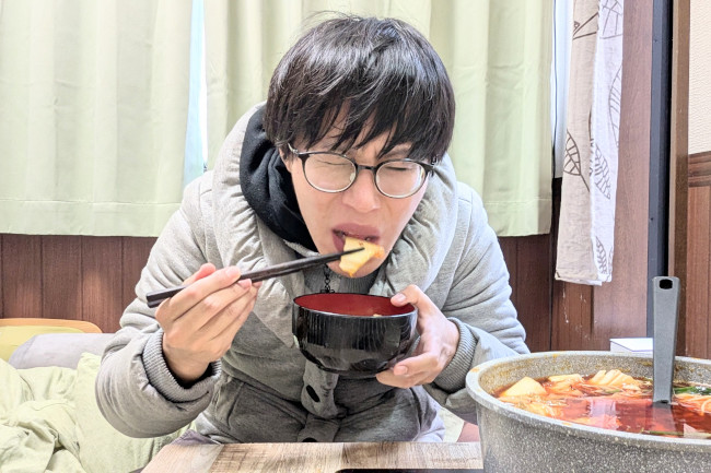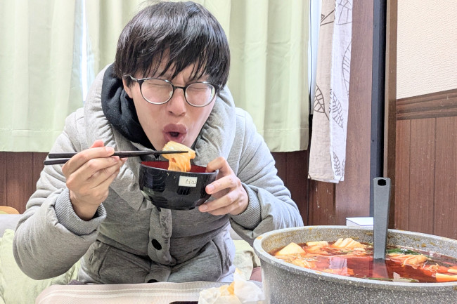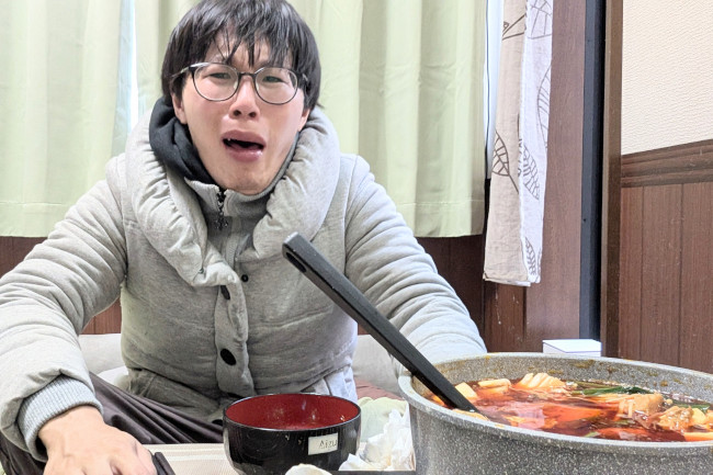 作中では、天井からコタツを吊るした状態で(つまりクソ暑い)、火鍋を食べてました。