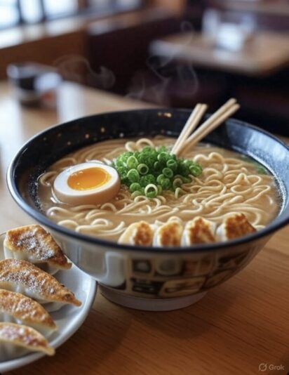 Grokにて生成、ラーメンと餃子のセット。なんで餃子を丼に入れるのか