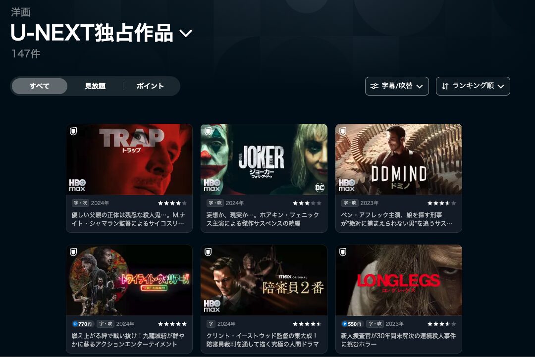 今年の1月に日本中を席巻したスーパーおもろバトル映画「トワイライト・ウォリアーズ 決戦!九龍城砦」やあのジョーカーの続編「ジョーカー フォリ・ア・ドゥ」など、劇場で話題になった映画の独占権を次々とU-NEXTが買っており、ネトフリに負けず劣らずな猛追を仕掛けてきています。他にも配信スルーされてる掘り出し物の独占作品も数多く取り揃えており、映画好きにはたまらないラインナップとなっています。
