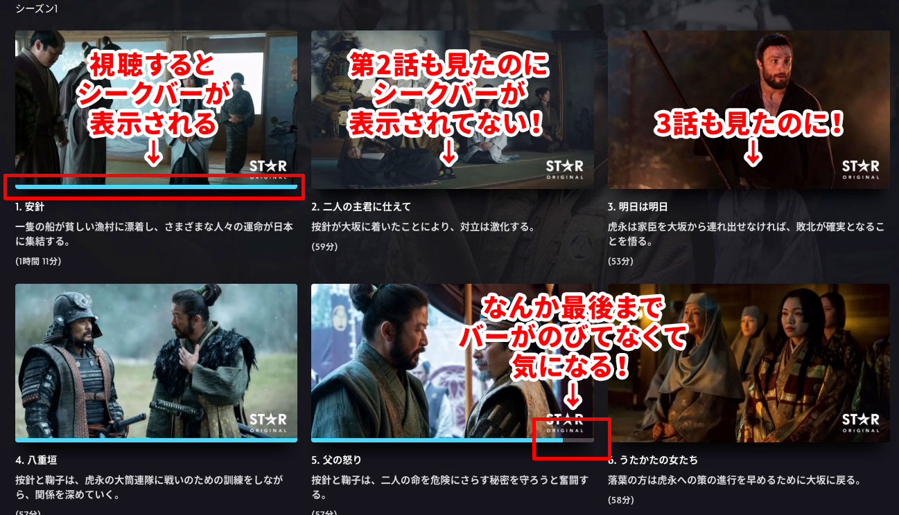 サブスクサービスはだいたい映画やドラマを視聴すると、サムネイルの下部にシークバーがのびて「全部見たぞ〜」「ここまで見たぞ〜」と分かるようになっています。が、Disney+はこのシークバーが何かずーっと変で、見終わったのにシークバーがつかないものがあったりしてかなり気になってます。