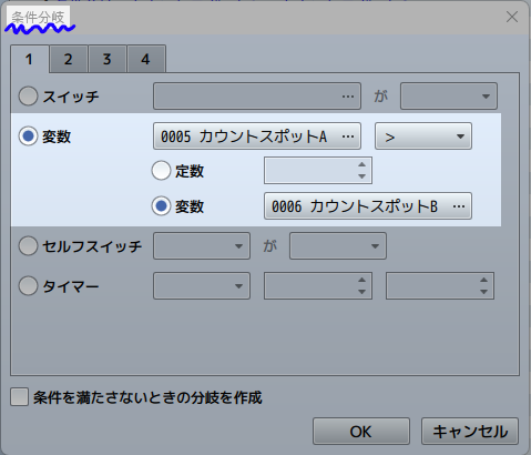 変数の数値に関する条件をつけることで、シナリオのルート分岐をさせることができる機能なのですが…