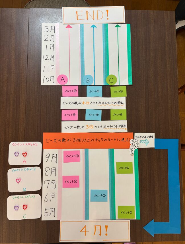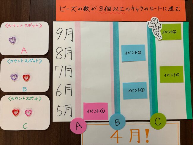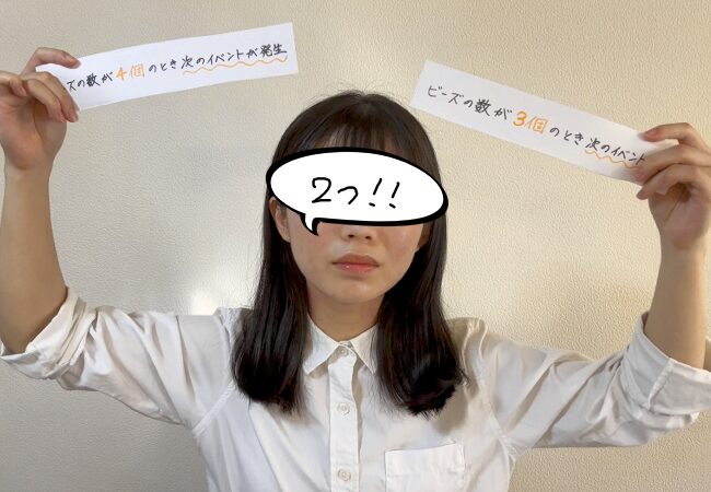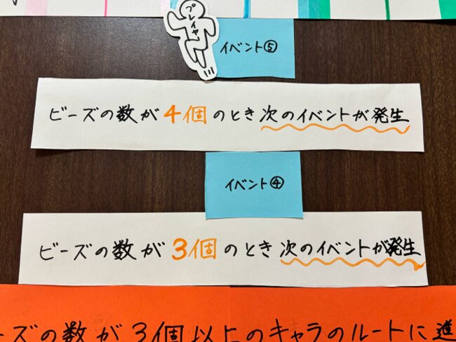 「ビーズの数が3個の場合」「ビーズの数が4個の場合」という分岐を用意することで、イベント④、⑤を見逃した人用のルートを作りました。
