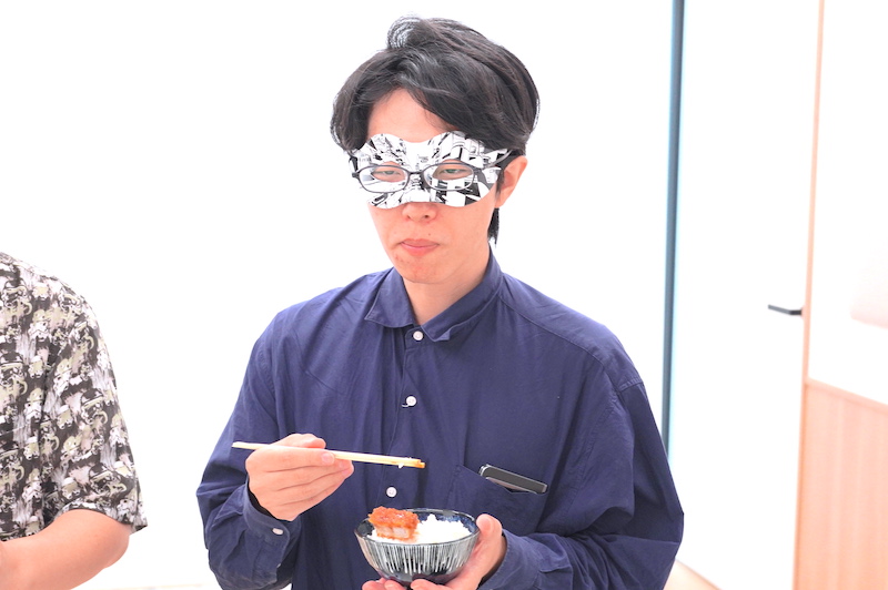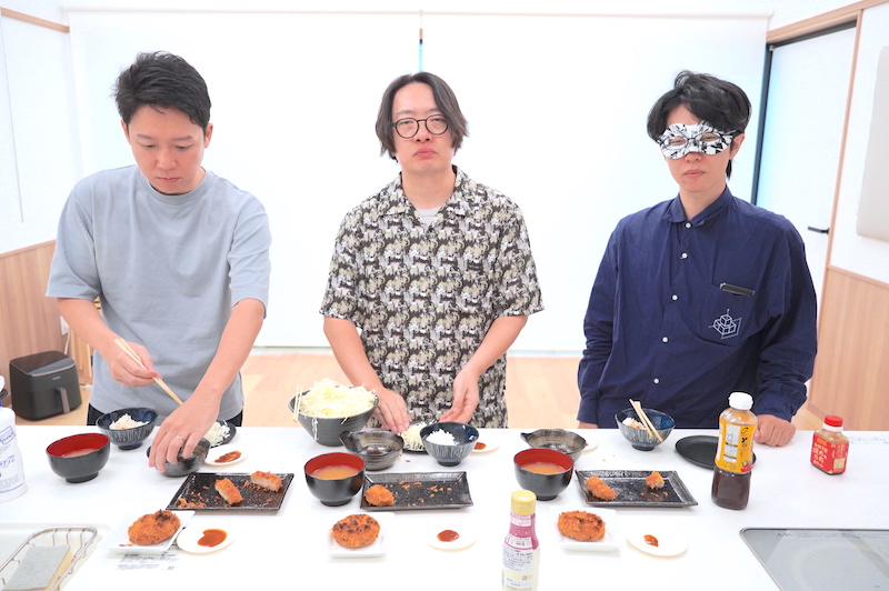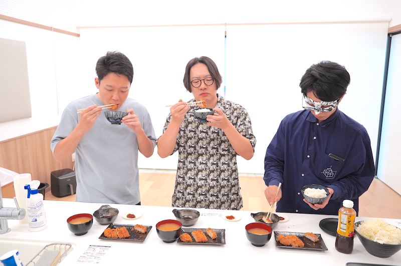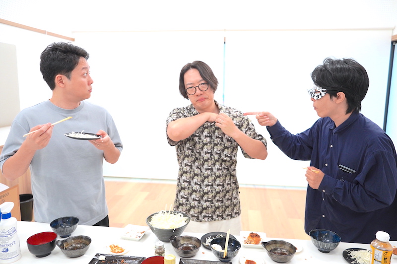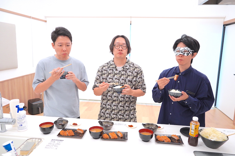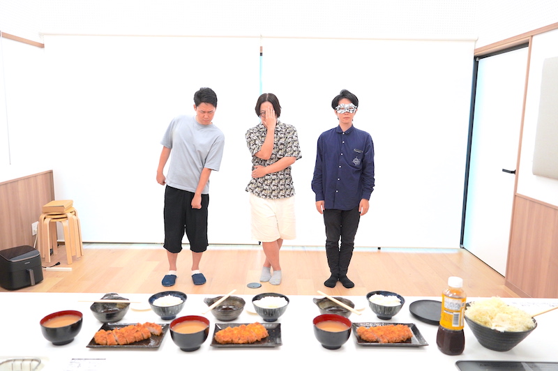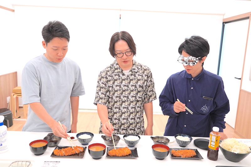 社内で身近な情報やニュースを取り扱う「ニュース!オモコロウォッチ!」の出演者(永田、原宿、ダ・ヴィンチ・恐山)に食べて頂き、この情報をニュースとして発信していいのか直接確認してみることにしました。