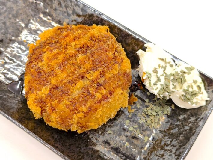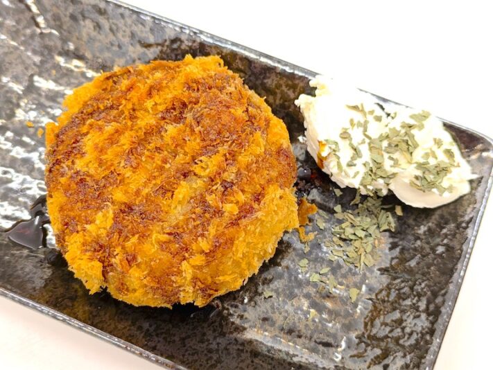 熱々のメンチカツと冷たいクリームチーズの相性もよく、口の中を火傷することなく肉の旨みと濃厚なチーズの旨み、さっぱりした醤油とバジルの香りを余すことなく堪能できます。