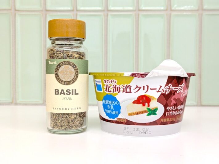 作り方はとても簡単で、市販のクリームチーズとバジルを追加トッピングするのみ!!