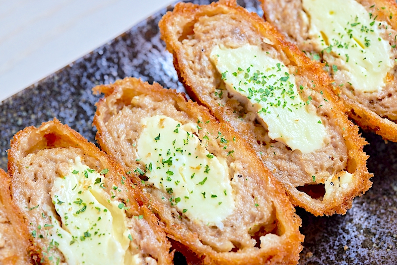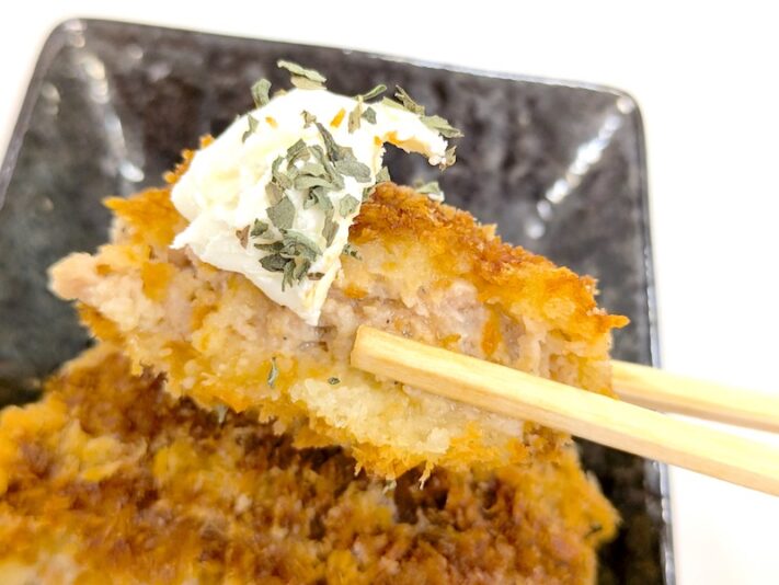 「クリームチーズ×バジル」を組み合わせたメンチカツは、一瞬にして絶品のチーズメンチカツに変化を遂げるので超オススメ!!
