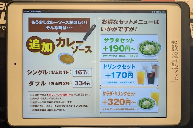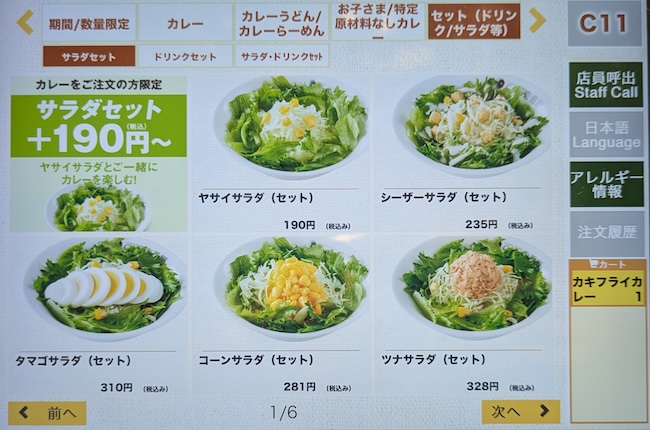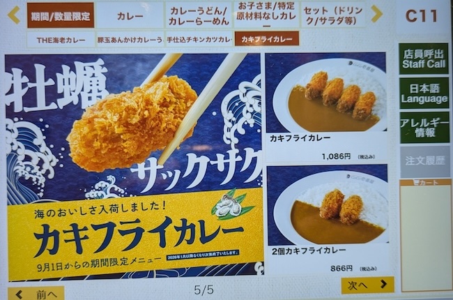 おっ、毎年秋頃から期間限定で販売されている「カキフライカレー」がもう出てるじゃない! これにしよっと! ご飯の量は250グラム、辛さは1辛で十分! 昔はいきがって5辛とかに挑戦してたけど、結局無理なくおいしく食べられるのが一番だからね。