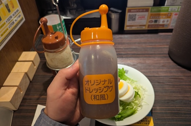 なーんて、さっきから健康に気を遣ってるようなこと言ってるけど、実はこの「オリジナルドレッシング」をたっぷりかけて食べるのが好きなんだよね。むしろ塩分過多かな? でもいいか! おいしいのが一番だし! このドレッシングを味わえるなら、寿命の1/16くらいは差し出せまーす! いやちょっと待って。80歳まで生きると仮定した場合、1/16となると……5年!? 5年寿命が縮むのはさすがに勘弁かも! 最初から75歳で死ぬって言われるならまだしも、80歳からのマイナス5年はきついって! あとこれは勝手なイメージだけど、70代で死んだ場合の死後の世界ってなんか砂漠が広がってそうじゃない!? 80代なら木々とか小川もありそうだけど! ごめん、とりあえずサラダ食うわ!