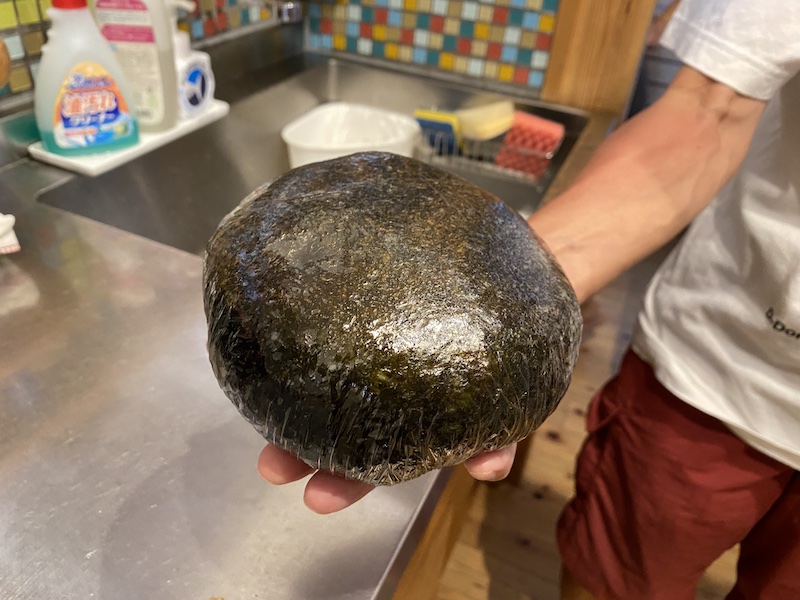 通常のばくだんおにぎりと比べてみました。黒く輝いていてボーリングの玉さながら。迫力満点です。