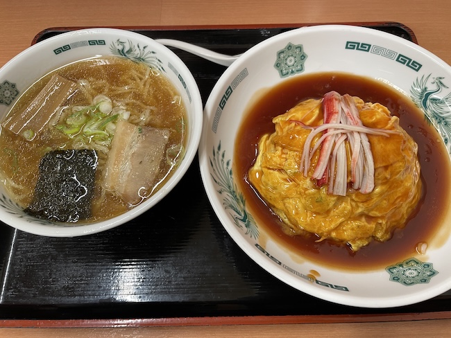 商店街の地下にある日高屋で、天津飯と半ラーメンのセットを食べて帰りました。