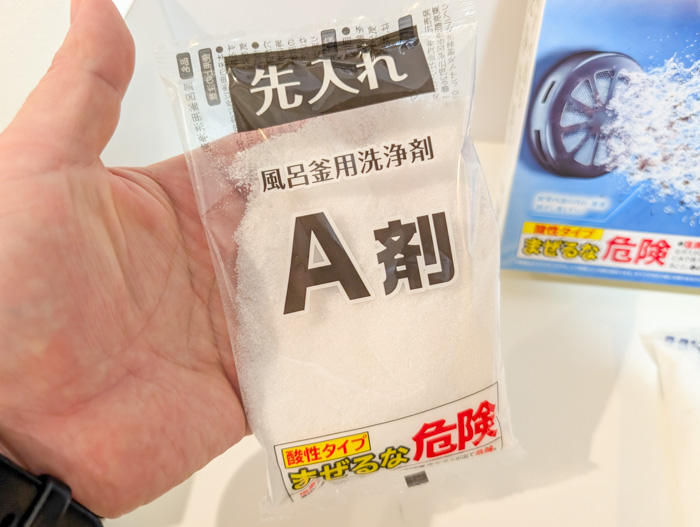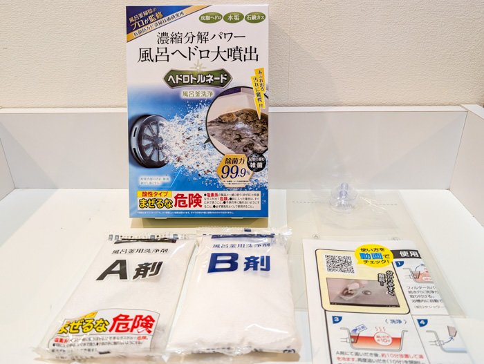 給水穴が1つの追い焚き機能がある浴槽専用で、”風呂釜洗浄のプロ※” が監修した家庭用洗浄剤! 酸性とアルカリ性、2種類の薬剤を組み合わせて配管をキレイにする仕組みだそうです。