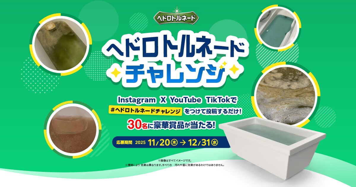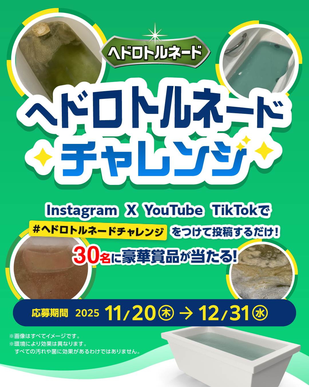 ヘドロトルネードを使用中の浴槽の様子を写真または動画で撮影し、ハッシュタグ「#ヘドロトルネードチャレンジ」をつけてSNS(Instagram、X、YouTube、TikTok)に投稿すると、30名様に豪華賞品をプレゼントするフォトコンテストを開催中!