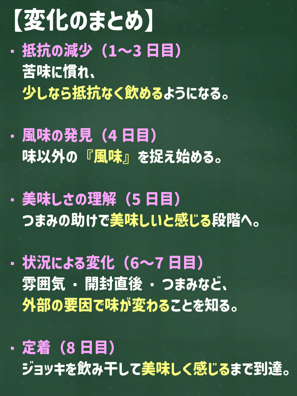 まずは喉がカラカラの時でも友達との楽しい飲みの時でも試行回数を重ねて慣れるでも、錯覚でもいいから『あ、意外とおいしいかも』と気付くことが転換期になると思いました。