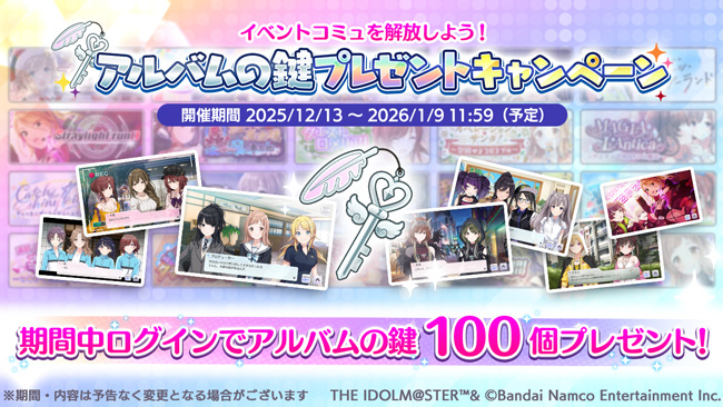 期間中にログインすると、過去にゲーム内で開催されたイベントコミュをアンロックして観ることができる「アルバムの鍵」を100個プレゼント!