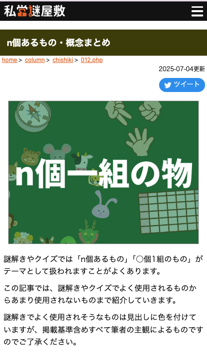 このページには「個数に対応するモノや概念」が一覧になっており、発想に詰まったときは助けを求めるように見に行ってます。