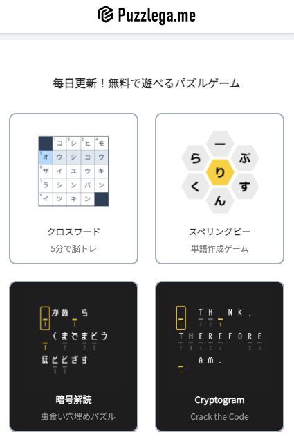 いろんなパズルが楽しめるサイトです。内容は毎日更新されるので頭の体操の日課としても楽しめます。僕は特に「絵文字しりとり」が面白くてハマりました。