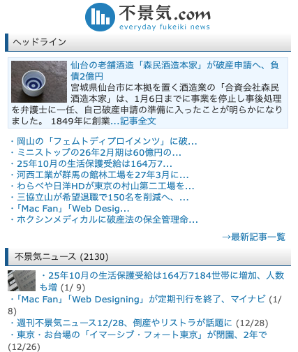 あらゆる不景気的なニュースをまとめるサイト。ギチギチに不景気情報があります。特に経済に関心があるわけではないのですが、なぜかたまに覗いてしまいます。世の中には数えきれないほどの会社があって、そして自分の知らないところで破産して消えていくと思うと、不思議な気持ちになるというか、宇宙の果てしなさを感じる気持ちと似てるかもしれません。