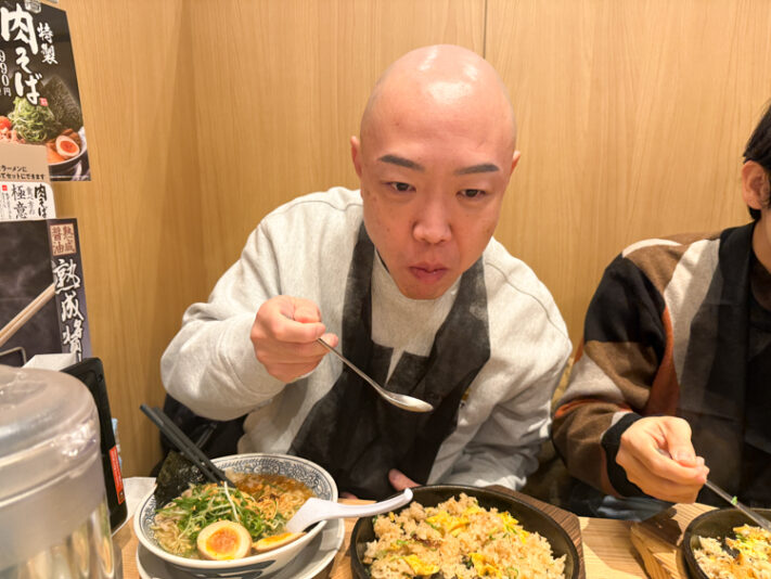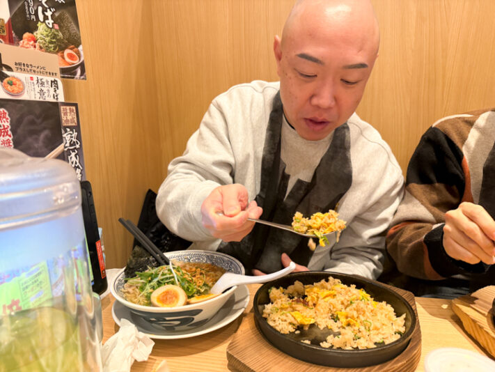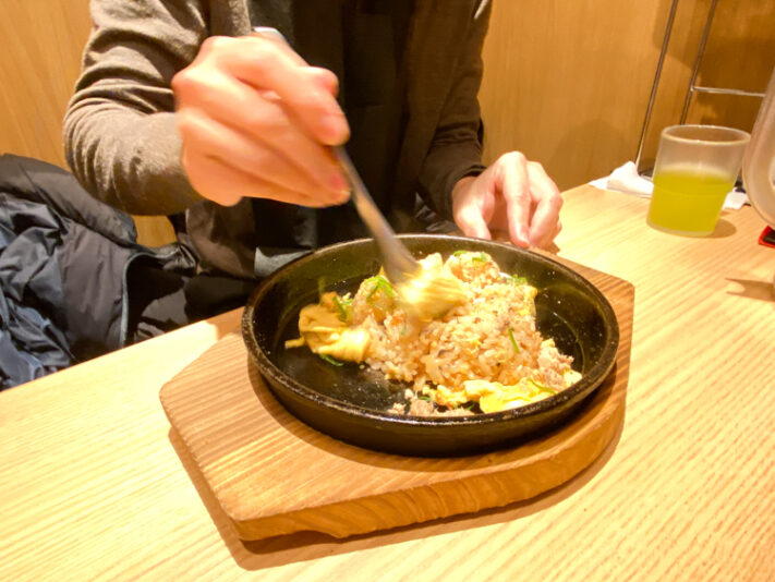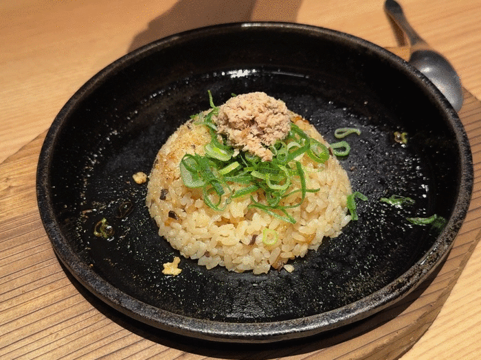 チャーハンは熱々の鉄鍋で提供され、その場で卵を落としてくれて仕上げるスタイル。出来立てを味わえるのはもちろん、鉄鍋ならではの軽いおこげができて、チャーハン特有の「パラパラ感」をしっかり堪能できました。さらに揚げにんにくが無料トッピングで用意されていて、これが味変として最高でした。