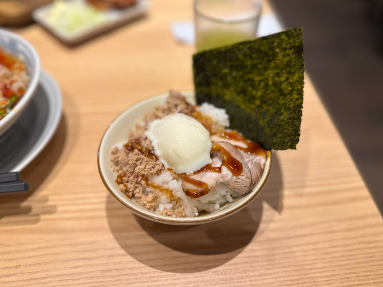 温玉チャーシューご飯もついでに頼んでみたのですが、こちらも肉そばとの相性は最高!やわやわのチャーシュー・プルプルの温玉・ほどよい温度の白ご飯、まさにお茶碗の中は冬の大三角形。ありがとうございました。