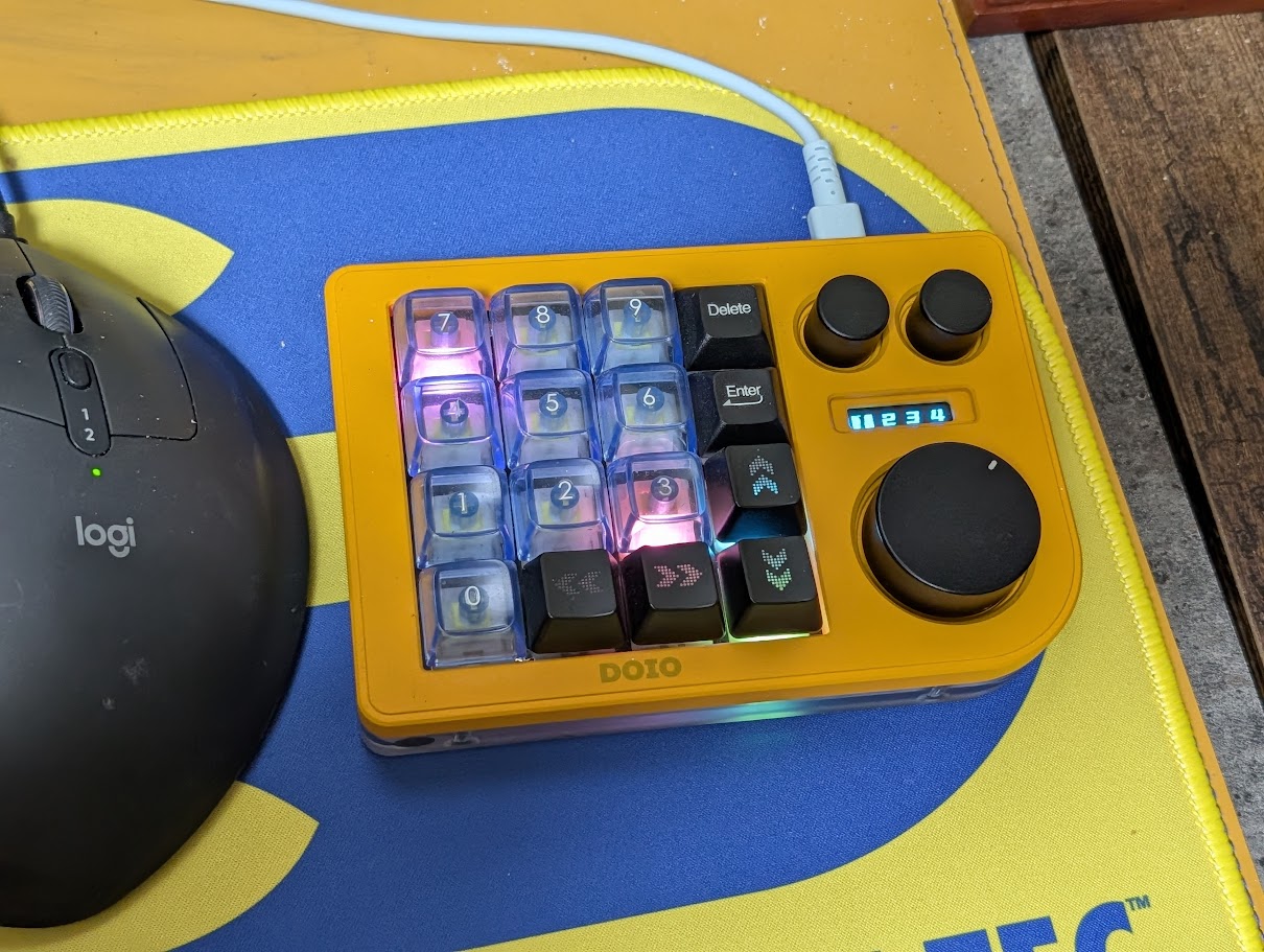 テンキーのないキーボードを使っているので、数字入力が多い時用のテンキーをいくつか買っている。これはマクロを組んで好きなキーに好きな動作を指定できるのだが、ぼくはただのテンキーとして使い、つまみ部分で音量を上下させたりしている。キーキャップを透明の物へ変更し、より光るように。