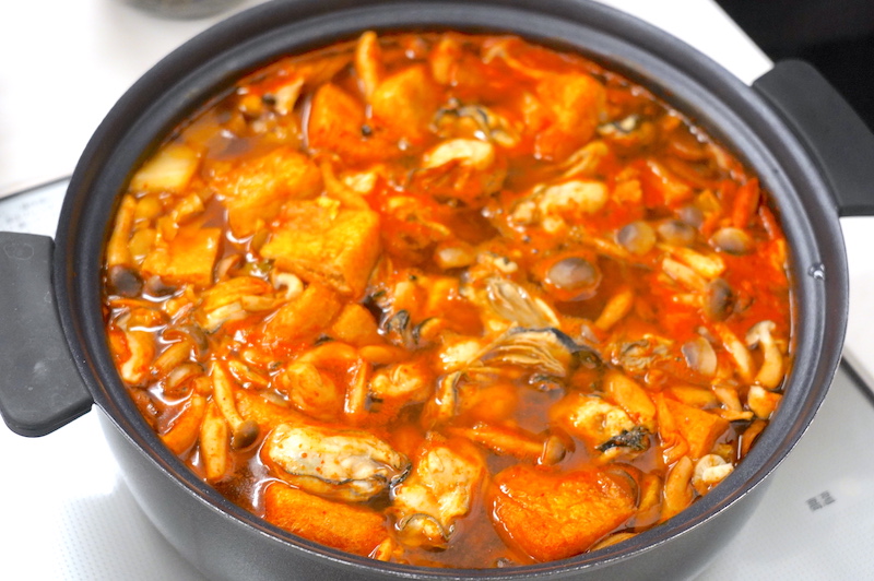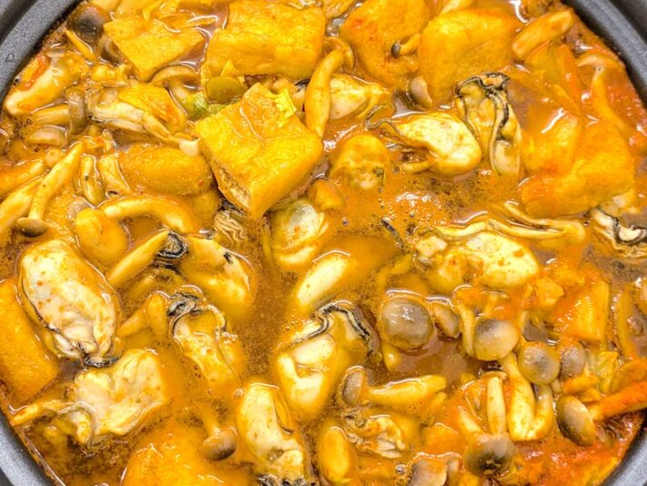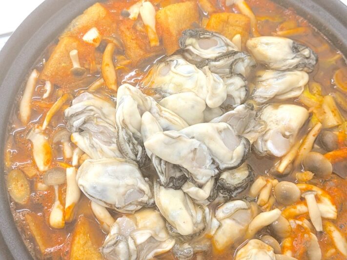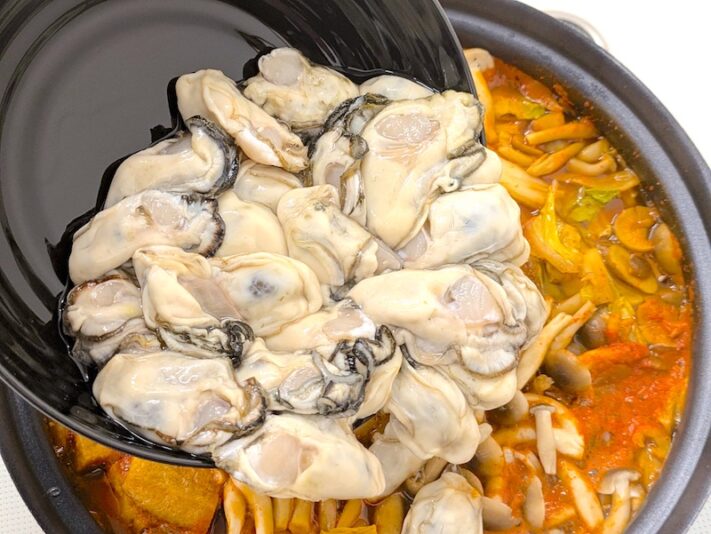 そのまま食べても美味しい生牡蠣なのですが、加熱しても美味しさのブーストが加速すると聞いたので、今回は「赤から鍋スープ3番」の辛い鍋の中に牡蠣を投入することに!!