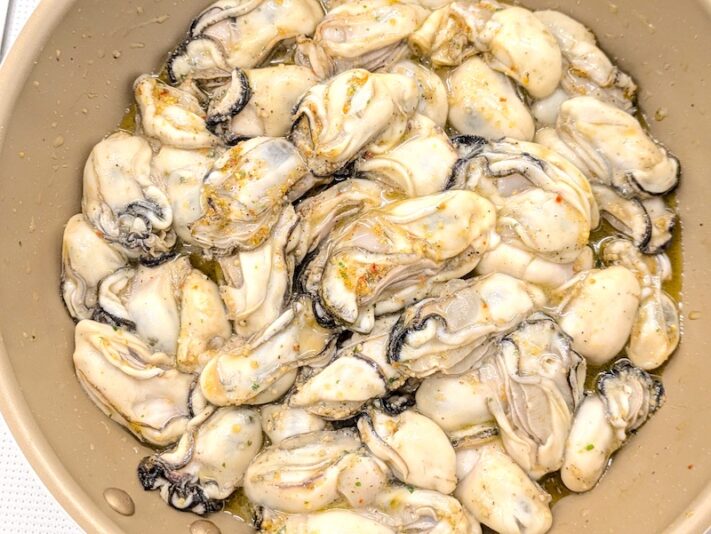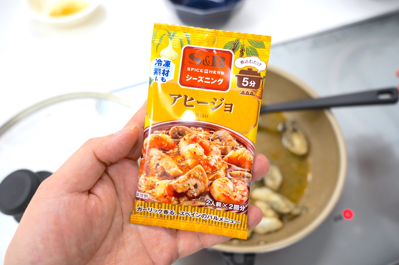 作り方は超簡単。オリーブオイルとバターを温めて牡蠣を入れ、市販で販売しているシーズニングミックス「アヒージョ」をふりかけて5分ほど煮込めば完成。