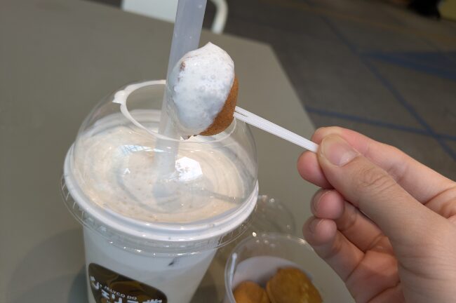 食感も素敵。わらびもちのモチモチと、玄米あられのカリカリで1カップ内の連鎖が止まらない。ストローで吸えるサイズの小さいわらびもち、面白いな。他ではあんまり見ない気がする。