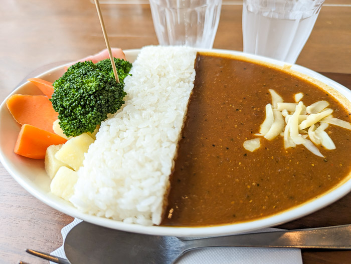 昼ごはんに食べた併設レストランのダムカレーもかなりオススメです。ダムの形に盛り付けられたカレーで、ブロッコリーの影に隠れたソーセージを爪楊枝で引き抜くとカレーソースが放流されるギミックが! 観光地メシにありがちな見た目だけではなく、しっかりスパイシーでめちゃくちゃおいしく作られていました。