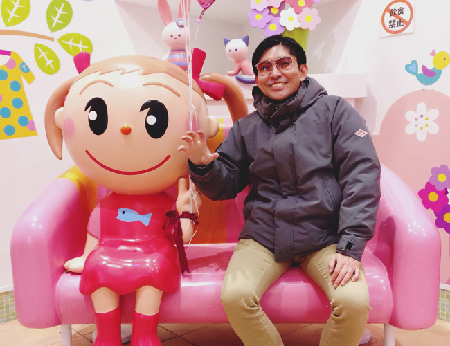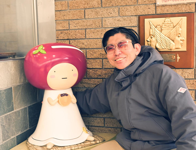 ミュージアムレストランの入り口で出迎えてくれた「あずきさん」とツーショットを撮影でき、ご満悦のJET