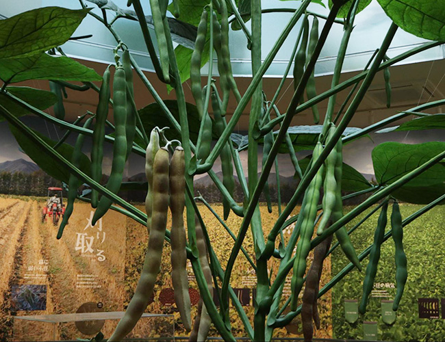 ミュージアム内の貴重な撮影スポット、10倍の鞘小豆。これは「エリモショウズ」という品種を拡大したもの。その名の通り、何もない春でお馴染み、襟裳岬のある北海道えりも町が名前の由来。ミュージアムでは、エリモショウズが栽培されている北海道十勝地方のあずき畑の、四季折々の様子が映し出されるVTRを見ることができる。かなり集中して見ることができる。