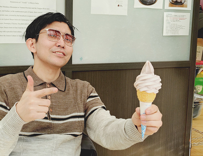 (あずきソフトにご満悦のJET。あずきだけでなく御座候の生地も使ってると書いてあった。気がする)