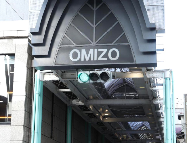 「おみぞ筋商店街」。インバウンド向けにローマ字表記もあって気が利いている。「KENZO」を思わせるロゴマークだ。