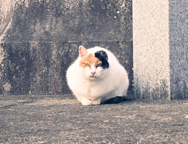 姫路城の横でこちらを睨みつける猫。近寄っても微動だにしない。